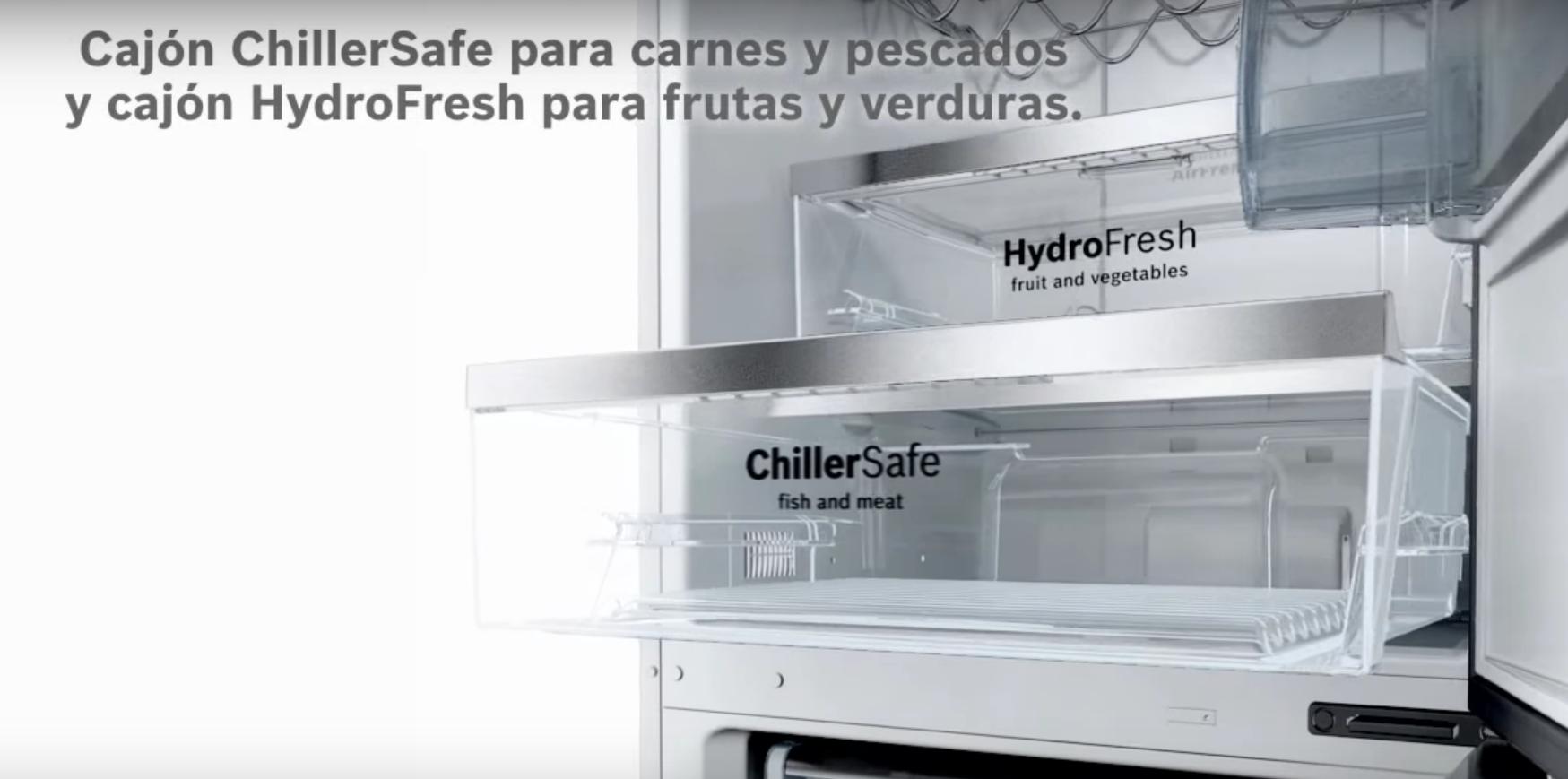 Los cajones Chiller Safe están pensados para poner carnes y pescados, su situación en el frigorífico es en la parte inferior de este, es decir, la zona más cercana al congelador y por lo tanto la zona más fria. Las frutas y las verduras tiene su espacio en el cajón Hydrofresh, justo encima del cajón para la carne y el pescado. Los cajones dan la opción además de tener sectorizada la comida que muy probablemente no estará envasada y por lo tanto con riesgo de generar líquidos que pueden ser muy fácilmente limpiables con estos cajones. Los cajones Fresh llevan carriles telescópicos para mejorar el deslizamiento de estos.