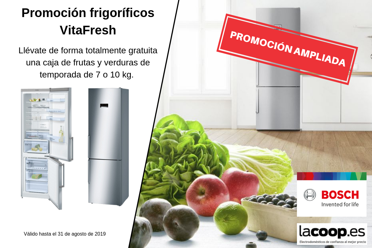 Un combi de 70 cm o un frigorífico de 1 puerta Serie 6 o Serie 8 de la marca Bosch, tendrán derecho a recibir de regalo una caja de frutas y verduras de temporada de 10 kg.